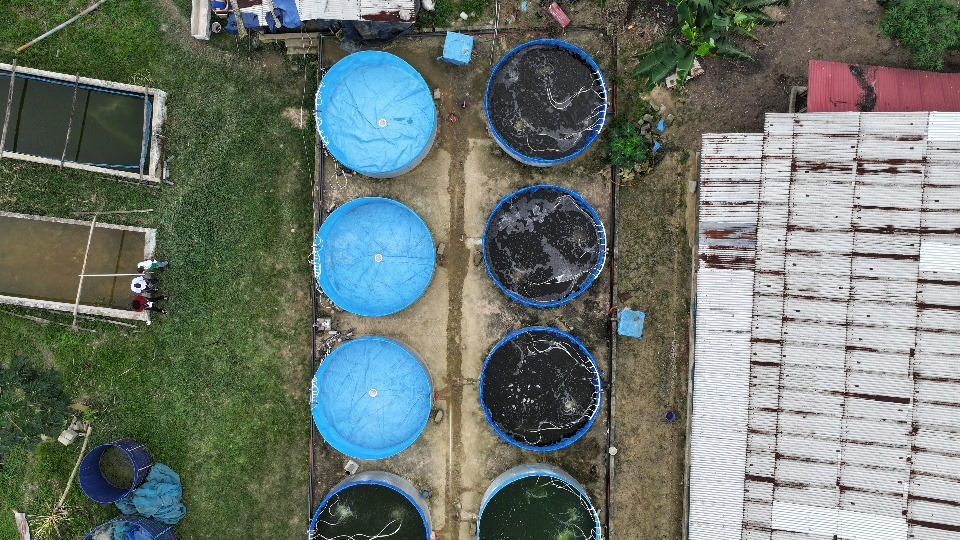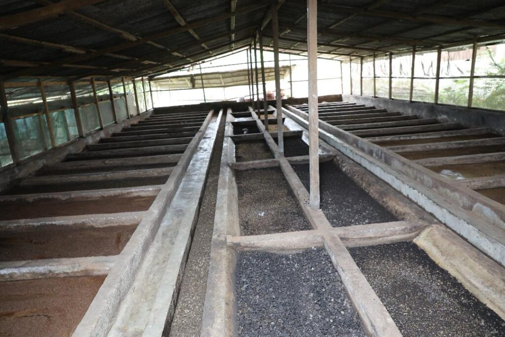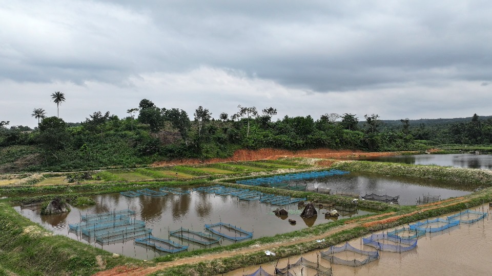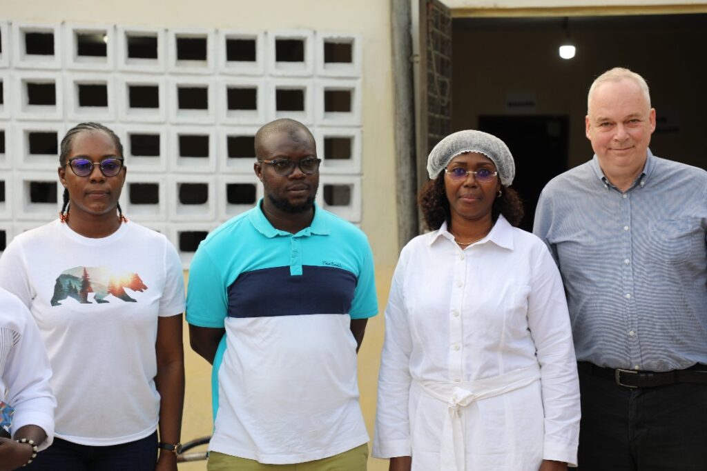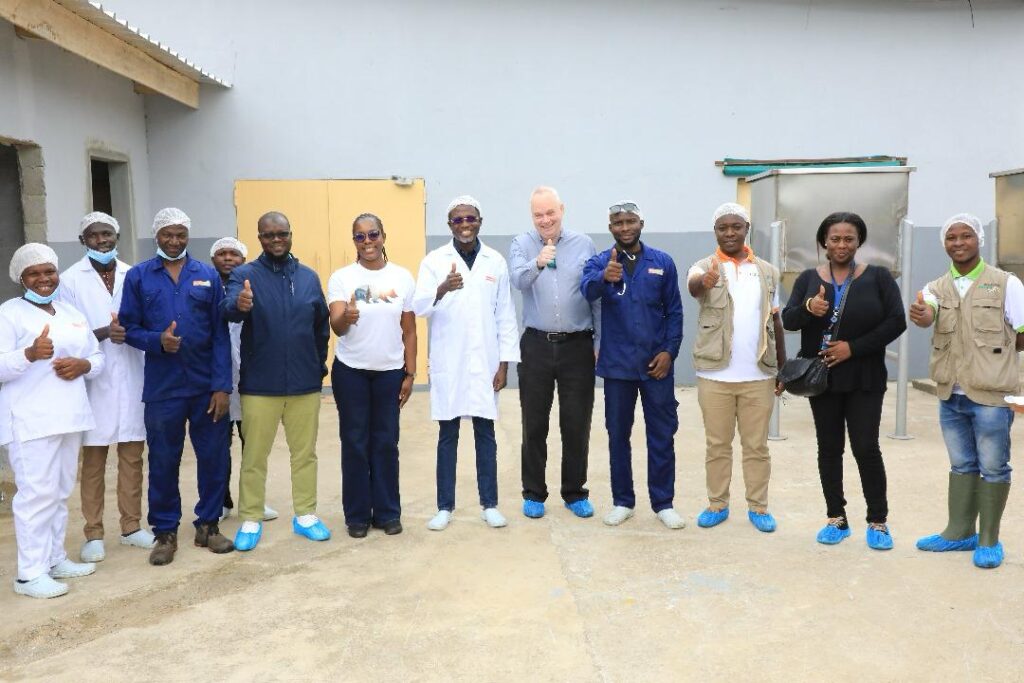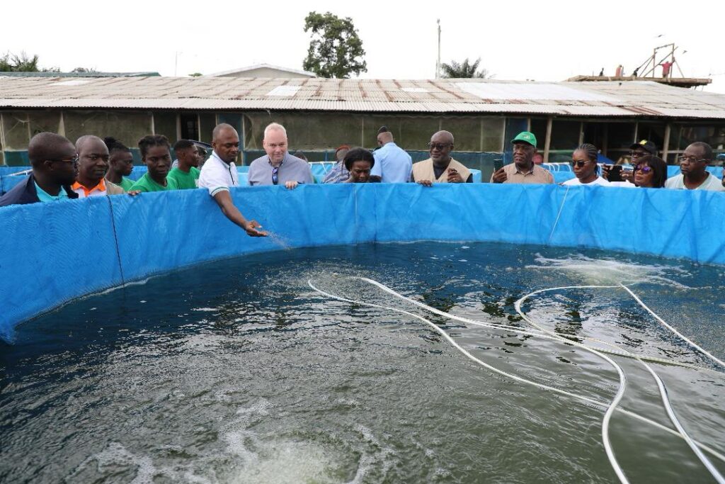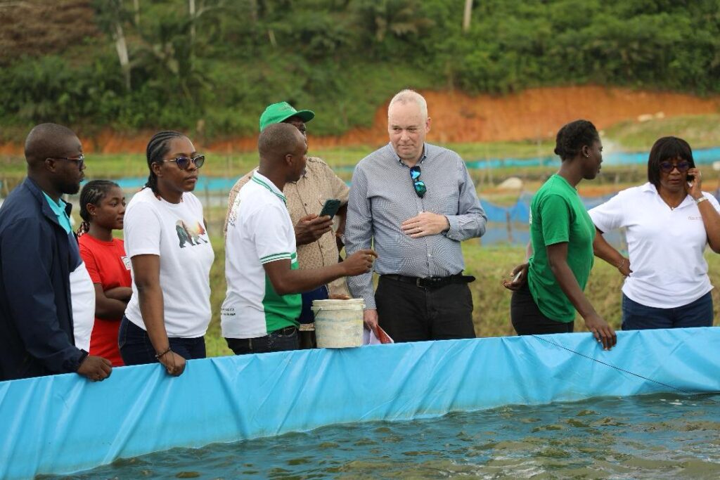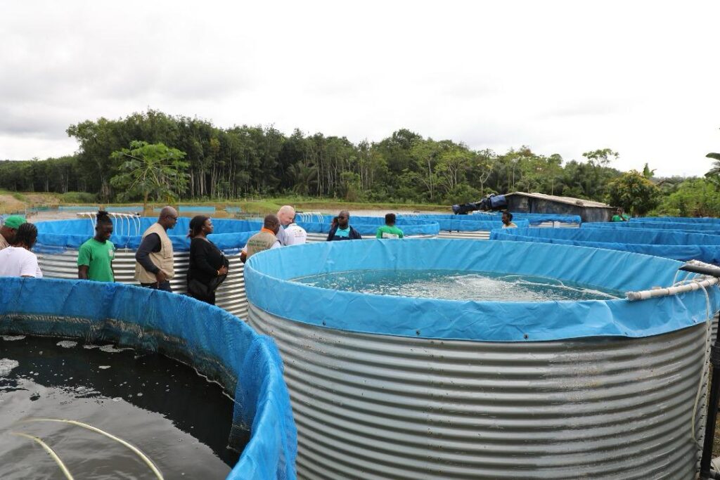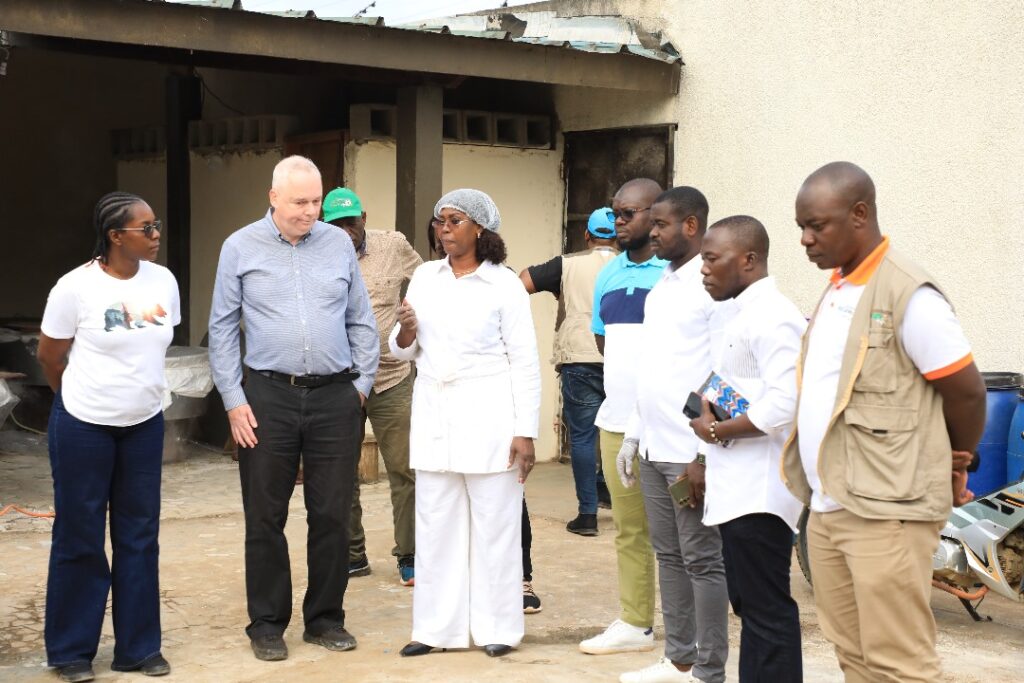 À Aboisso, la délégation s’est rendue sur le site de Poly Élevage, entreprise de Augustin MILLAN, spécialisée dans la production d’alevins et d’aliments pour poissons à base de mouches soldats noires. L’exploitation, qui assure également le grossissement des poissons et des formations spécialisées, dispose aujourd’hui de 10 bacs hors sol, de 15 étangs (dont 10 réhabilités et 5 nouvellement construits) et d’une retenue d’eau. Avec l’appui du PDC2V, l’entrepreneur ambitionne de produire 1,5 million d’alevins d’ici la fin de l’année 2025.
