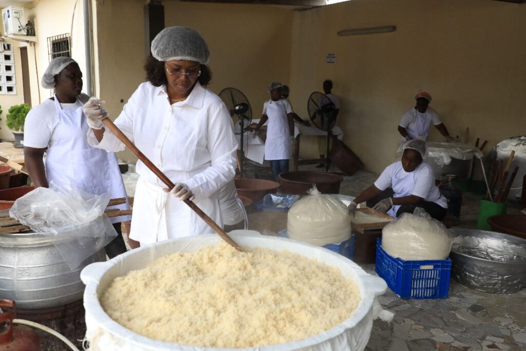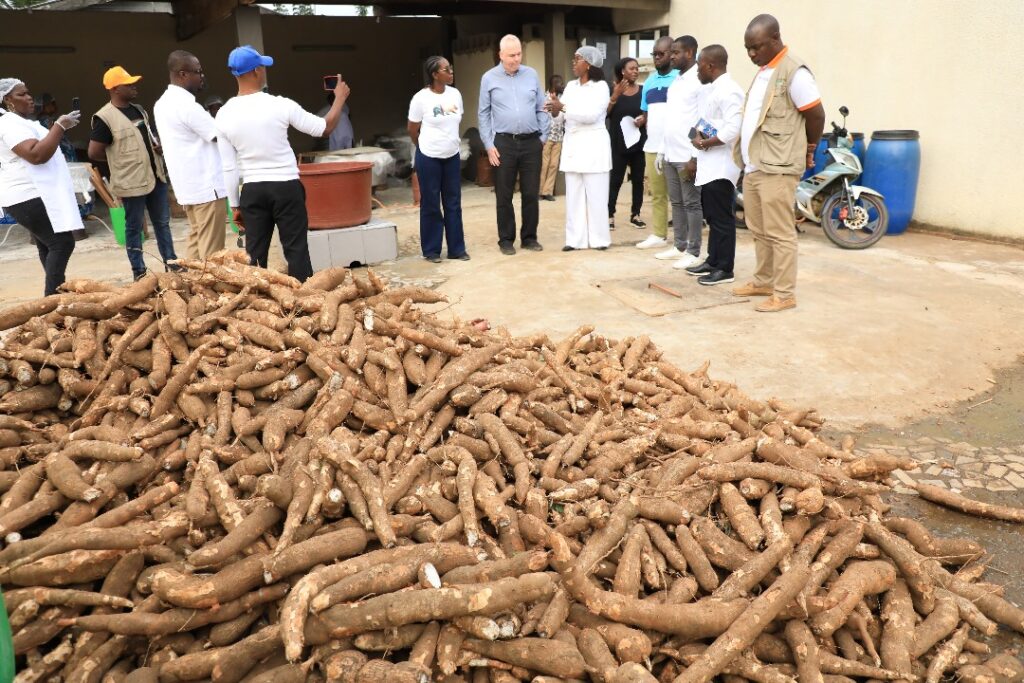 À Yaou, dernière étape de la tournée, la délégation a visité les installations de Group Eroveem-FY, gérée par Ezinlin Epse Yavo Bayo Euphrasie. Active depuis mai 2020 dans la transformation du manioc en attiéké et placali, l’entreprise a transformé 545,9 tonnes de manioc entre août 2024 et juillet 2025 (396,2 tonnes d’attiéké et 149,6 tonnes de placali). Grâce au FCP, l’unité a pu se moderniser avec l’acquisition d’un groupe électrogène, de trois essoreurs, de deux broyeurs et d’un séchoir, ainsi que l’achat de manioc. Elle emploie environ 80 personnes, dont 90 % de femmes, et vend ses produits sur le marché national et à l’international. La délégation a salué la qualité de la production et encouragé l’entreprise à viser la certification ISO.