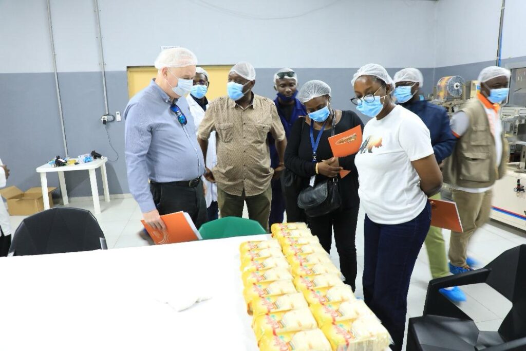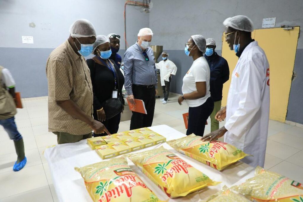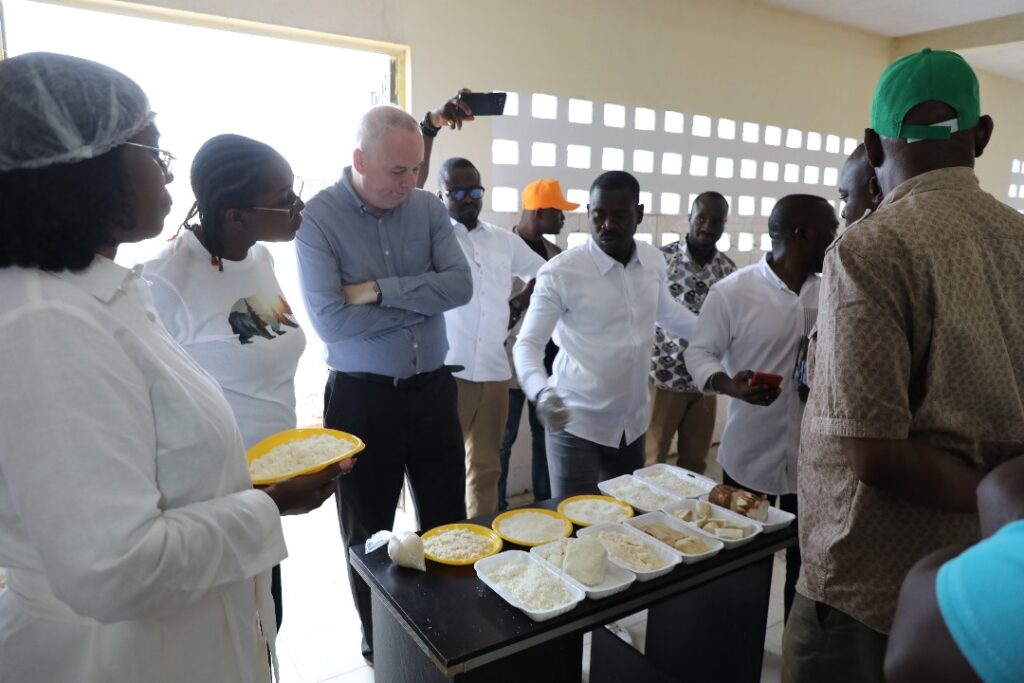 Au cours de cette mission, trois localités ont été visitées, chacune illustrant un maillon essentiel du développement agro-industriel local. À Alepé, la délégation a découvert Nourivoire, unité moderne de production d’attiéké « Attiéké Choco », dirigée par KRE Maxime. Bénéficiaire du guichet B de la première cohorte du FCP, l’entreprise produit aujourd’hui 250 tonnes d’attiéké destinées au marché local et à l’export. Les équipements de dernière génération acquis grâce au financement du PDC2V ont suscité les félicitations du représentant de la Banque mondiale pour la qualité de leur utilisation et la bonne exécution du projet.